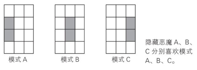 不同的模式对应着相应的数字格子的组合。如下图。模式A对应的是数字4和7,B对应5和8,C对应6和9。